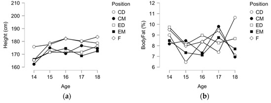 The normal growth patterns were found in the current research, namely considering the progressive increase of height and body mass until the last stage of youth [36,37]. Thus, the older the player is in youth soccer, the taller and heavier is. Such an evidence is confirmed in previous studies comparing different age groups withing the period of growth [38,39]. Interestingly, in the contrary to a possible expectation of observing an improvement in body fat levels [39,40], no significant differences were found across the age-groups in the current study. One of the causes could be the small body fat levels observed in the current study (mean values were stable around 8% over the ages) which is low, mainly in comparison to the studies reporting body fat in youth soccer players which presented values between 7 and 11% [36]. Also, in the opposite to expected [28,41], no significant differences were found in anthropometric and body composition data between playing positions. Although the current sample does not include goalkeepers (which is one of the positions favorable to be taller than remaining) [42], it would be expectable to observe significant variations between the remaining positions. As average (since interactions with age was not found), playing positions varied from 170 to 180 cm, while body mass between 60 and 70 kg. Although variations were observed, no significances were found, which may indicate that the tendency for selecting players based on playing position may not be too much implemented in the context of this group of players (considering that all of them belong to the same club).