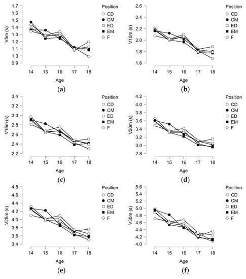 In Figure 2, descriptive plots for 15 m, 20 m, 25 m, 30 m, Maximum Speed, and ASR were presented. It seems evident a significant trend for being faster as older as players are (independently of the distance considered in the sprint test). Moreover, maximal speed sprint and anaerobic speed reserve also increase as players are older.