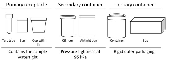 Safe packaging systems consisting of three elements are used when transporting Category A infectious substances [8]. The primary receptacle is usually a test tube or cup with a lid containing the infectious materials. The secondary packaging is usually a bag, cylinder, or box containing the primary receptacle. Finally, the tertiary or outer package is a closed box or package for transport (Figure 1). Packaging systems for Category A materials must comply with Packing Instruction P620 [4,5], which includes the following tests: Drop resistance from a height of 9 m, puncture test, water spray test, stacking and, most importantly, the ability of the primary receptacle or secondary packaging to be able to withstand a minimum internal pressure of 95 kPa without leakage at temperatures between −40 °C and +55 °C. To perform these tests, the standard UNE-EN-ISO 16495:2014 or ISO 16495:2022 can be used, which defines the test procedures with which the containers and packaging for the transport of dangerous goods must comply [9,10]. Although this standard is not mandatory, its results are generally accepted by the administration and the entities involved in the transport of infectious substances. The packaging requirements for clinical waste and Category B specimens are less restrictive (Table 1) [4,5].