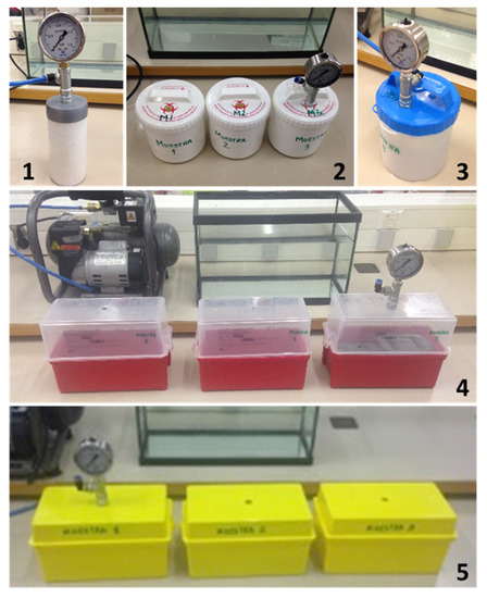 Five types of secondary and tertiary packaging available on the Spanish market for shipping Category A infectious substances were selected for this study. All of the selected packaging types are commercially marked as suitable for the carriage of dangerous goods in a primary receptacle. The manufacturers or distributors of the selected packaging systems in this study do not supply a specific primary receptacle or provide information about what primary receptacle must be used, so it is assumed that it is the user’s responsibility to select the primary receptacle that best suits the characteristics of the infectious specimen. As per the ADR, the packaging systems for Category A infectious substances must comply with the following resistance tests: free-fall drop, puncture test, water spray test, stacking up to 3 m, and overpressure test at 95 kPa. Among these tests, the most difficult to comply with is the overpressure at 95 kPa. Moreover, the overpressure test is related to the breakage of containers and the leaking of infectious substances during transportation as reported in the literature [15]. In this study, the pressure leakproof test was performed on each of the selected secondary containers shown in Figure 2.