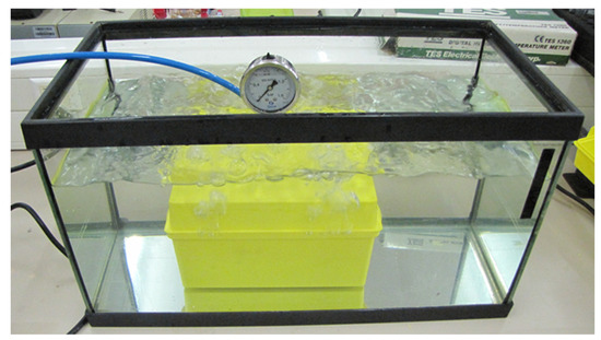 The leakproof tests have been carried out by injecting pressurized air into the secondary container submerged in a tank full of water. The containers were filled with lead weights to keep them submerged during the tests. In this way, whether or not the packages were leakproof could be determined visually by the formation of bubbles in the event of leaks. The air was injected using a compressor (SENCO, model: PC1010N) with a maximum output of 860 kPa, through a threaded connector that was installed on the lid of each container to be tested (Figure 3). A T-type union was installed on this connector to simultaneously connect the air supply from the compressor and a pressure gauge to measure the pressure at the container inlet. The compressor had a pressure reducer at the air outlet that allowed the adjustment of pressure supplied to the container. All connections were checked to ensure that there were no air leaks and that the gauge reading was stable and reliable. The maximum pressure supported by each of the containers before the detection of air leaks was recorded, as well as the time that it remained at that maximum registered pressure.