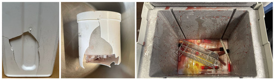 Poor practices in the transport of specimens and infectious waste were also occasionally reported [18,19,20,21,22] with the use of non-approved packaging, the combination of specimens of different types in the same packaging, the lack of use of the secondary package, or even the improper transport of specimens increasing the risk of breakage (Figure 6). For example, the use of unsafe vehicles (e.g., private vehicles or public transport) for infectious specimens is inappropriate as is carrying specimens in toolboxes, camping coolers, or sports bags as tertiary packaging. Another example of poor practice is the transport of specimens in approved containers but outside the vehicle, with the risk of breaking the container and dispersing its content [20].