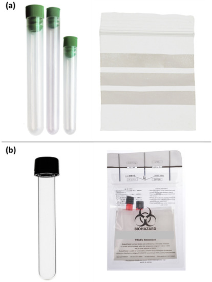 The international regulations [4,5] require that the internal overpressure test must be passed by the primary receptacle or the secondary container. In case the secondary packaging fails the test, the user must be warned that it is mandatory to use primary receptacles that can withstand the internal pressure of +95 kPa. The primary receptacles shown in Figure 7 are commonly used for transporting infectious specimens. However, not all test tubes or bags pass the internal pressure test at +95 kPa. For example, test tubes with stoppers, such as those shown in Figure 7a, do not pass the pressure test. Simple zip-lock plastic bags often leak at the zip-lock or side edge due to poor sealing. Under these conditions, the user must have sufficient knowledge of the regulations and the characteristics of the primary receptacles to select those receptacles that meet the packaging regulations for the infectious specimens, e.g., test tube with screw cap or plastic bags with flap and double zip-lock (Figure 7b). The manufactures of these primary receptacles have reported their hermetic tightness under +95 kPa overpressure conditions.