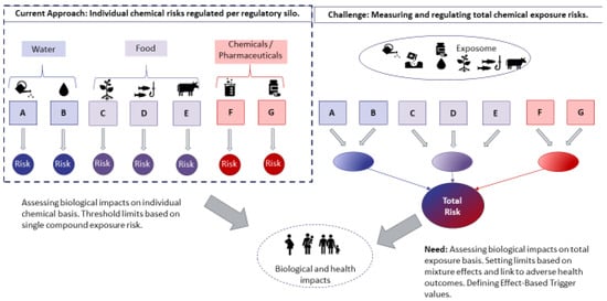 To capture all chemicals that might be relevant for a MRA (industrial chemicals, biocides, pesticides, medicines, etc.), it is necessary to regulate co-exposures across regulatory silos and look at mixtures in an unbiased way. From studies on ecotoxicological effects of water quality, we know that even if we analyse hundreds of chemicals, we are still not able to explain all the toxic effects arising from these water samples by the identified chemicals []. This phenomenon has been observed also in in vitro studies on human blood and tissues, where 35 out of 100 analysed chemicals were detected, but their predicted mixture effect derived from single-compound modelling explained less than 2% of the experimental mixture effect (activation of the arylhydrocarbon receptor and cytotoxicity) [].