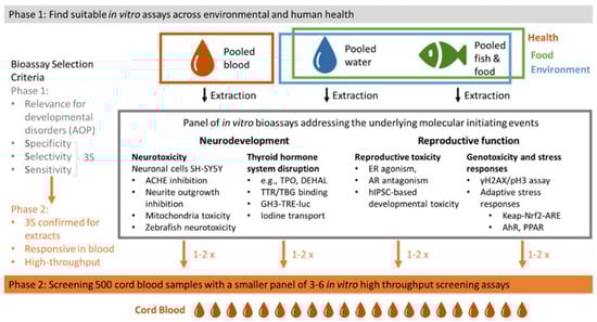Regarding the hazard characterisation component of PANORAMIX, we will apply a whole mixture-based approach, using a panel of in vitro bioassays with endpoints that can be mapped to classical toxicological endpoints, such as impairment of reproductive and neurodevelopmental functions. Both are known to be compromised by a great variety of chemicals, and particularly chemical mixtures [,,,]. For this purpose, each extract will be assessed in a panel of up to 20 well-established and carefully selected cell-based or cell-free in vitro bioassays with endpoints related to reproductive toxicity and neuro(developmental)toxicity (Figure 2). This panel includes measurement of neurotoxicity in human neuronal cells, including neurite outgrowth inhibition [], acetylcholinesterase inhibition [] and mitochondrial toxicity [], neurodevelopmental assessment in zebrafish embryos [], developmental toxicity in embryoid bodies derived from human-induced pluripotent stem cells [], thyroid hormone disruption, such as binding to the transport protein transthyretin [], inhibition of uptake and efflux of thyroid hormones [], thyroid hormone receptor activity [], activation/inactivation of thyroid hormones, iodide utilisation and recycling [,,], oestrogen, androgen and aryl hydrocarbon receptor activities [], genotoxicity, including identification of potential aneugenic and clastogenic activity [], and finally measurement of oxidative stress [].