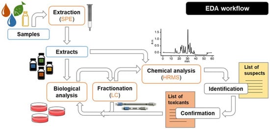 Schematic representation of the workflow entailed by the effect-directed analysis approach. EDA: effect-directed analysis; HRMS: high resolution mass spectrometry; LC—liquid chromatography; SPE: solid-phase extraction.
