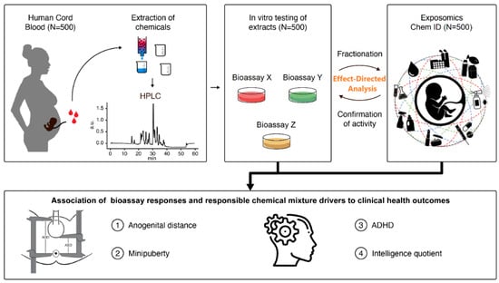 As one possible strategy, we suggest characterising the link between mixture exposure of the foetus and the development of reproductive and/or neurobehavioural dysfunction at early age. With this purpose in mind, we will analyse cord blood samples collected at birth in the Odense Child Cohort (OCC) (Figure 4). OCC is an on-going prospective birth cohort wherein newly pregnant women residing in the Odense Municipality were offered participation from 2010–2012 []. Following enrolment, the women’s general health and lifestyle was assessed. Gestational age of the mothers, as well as birth weight, length and head and abdominal circumference of the newborns were obtained from birth records and a cord blood sample was stored. At child age of 3 months, 1½, 3, 5 and 7 years, parents answered questionnaires on child and maternal health, and the child underwent a clinical examination. Currently, over 2500 children are enrolled in this cohort and data on important health outcomes for the children is well-documented, in particular reproductive toxicity-related outcomes, including anogenital distance as a non-invasive hallmark of incomplete masculinisation and several sex hormones, as well as neuropsychological development function, such as the assessment of language development (vocabulary and complexity) using MacArthur-Bates Communicative Development Inventories report, the Child Behaviour Checklist for ages 1½–5 years that comprises 100 questions regarding behavioural, emotional, and social problems, six of which represent an attention deficit hyperactivity disorder problem scale, and the intelligence quotient score at the age of 7, based on subtests of the original Wechsler’s Intelligence Scale for Children. Thus, this cohort can provide unique cord blood samples to study chemical mixture drivers to which the foetus is exposed.