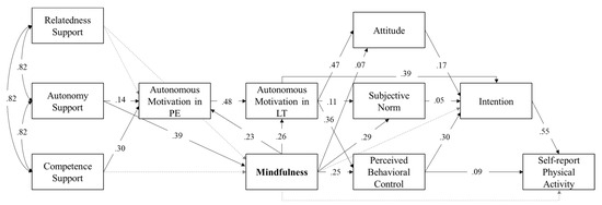 Autonomous motivation in leisure time was directly related to attitude, subjective norm, and perceived behavioral control, which, in turn, positively predicted self-reported physical activity, mediated by intention. These findings support the assumptions of the trans-contextual model [1]. Put differently, autonomous motivation had a positive impact on the crucial components for the formation of a behavioral intention. Regarding the influence of autonomous motivation on subjective norm, we obtained mixed findings. In Model 1a and 1b, a small but significant positive effect was found. It needs to be stated that there is a disagreement in the scientific literature, as some scholars do not presume an association between the perceived subjective norm, representing a concept of social pressures, and autonomous motivation [81]. In contrast, several studies have presented evidence for a significant positive path between these two constructs [5]. The positive relationship between autonomous motivation and subjective norm found in some of our models might be interpreted as the respect or recognition of the wishes of the significant others as supportive or in accordance with self-endorsed values. In Model 1b, compared to Model 1a, however, the path coefficient decreased when adding mindfulness, and turned statistically insignificant in Model 2b.