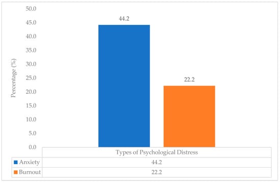Anxiety is a psychological and physiological condition, characterized by cognitive, somatic, emotional, and behavioural components. It acts as a protective factor against threatening situations, while burnout entails feelings or experiences of exhaustion, cynicism, and lack of professional efficacy [,]. Anxiety is normal when it is intermittent and expected, based on certain stressful events or situations. However, prolonged anxiety might result in psychological distress affecting an individual’s everyday functioning.