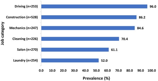 Exposures to carcinogens were observed to be disproportionate among different types of jobs. The overall prevalence of exposure to any carcinogenic agents within job categories is illustrated in Figure 1. While mechanics had the highest prevalence of exposure to diesel exhaust (62.3%) and mineral oils (43.7%), laundry workers were most frequently exposed to chlorinated solvents (39.8%), including tetrachloroethylene (PERC) (36.6%) and trichloroethylene (28.3%) (Table 3). On the other hand, drivers and cleaners were mostly exposed to diesel exhaust (95.7%) and mineral oils (46.5%), respectively. About three in ten participants working in salons had probable exposure to formaldehyde (29.6%) and environmental tobacco smoke (28.9%). Construction workers were most frequently exposed to silica (48.5%), environmental tobacco smoke (33.7%), chromium (31.6%) and wood dust (27%) (Table 3).