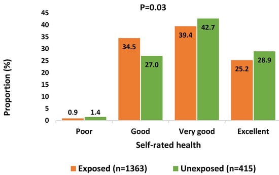 Participants were asked to rate their overall health. Around 60% of them rated their health status as excellent (26.1%) or very good (40.2%), and only 18 participants (1.0%) as poor. There was a significant difference (p = 0.03) in self-rated health between workers exposed and those not exposed to carcinogens (Figure 2). Workers occupationally exposed to carcinogens had significantly lower chance to have a higher health rating in the crude analysis (COR = 0.781, 95% CI [0.638–0.957]), as well as when adjusting to potential confounders (AOR = 0.783, 95% CI [0.638–0.961]) (Table 4).