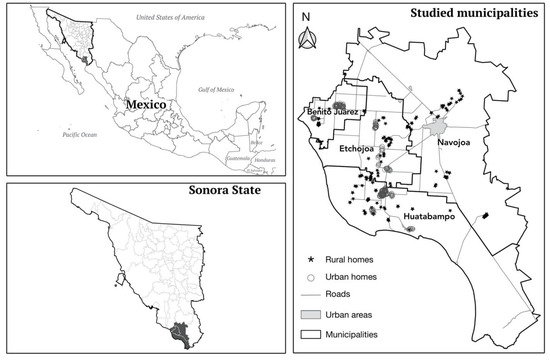 Participants’ homes were each geographically referenced with a global positioning system (GPS) eTrex® Legend (Garmin Ltd., Olathe, KS, USA) with an accuracy of ±3 m. Once each home was georeferenced and studied within each municipality, it was subdivided as urban or rural, except for Navojoa, whose population was solely rural, according to the AGEB classification (Spanish acronym for Basic Geostatistical Area) as determined by the Mexican National Institute of Statistics and Geography (INEGI) [30].