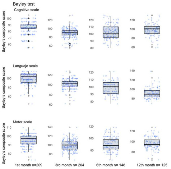 Mean language, cognitive, and motor development indices of the offspring at each age of evaluation were between low-average to average: 84.5–102.6 points. We observed an apparent declining tendency in the language scale as age increased during the first year of life, but not in the motor and cognitive scales; however, when a Mann–Kendall trend test was performed, we found no statistical differences by age in any scale (p > 0.05) (Figure 2).