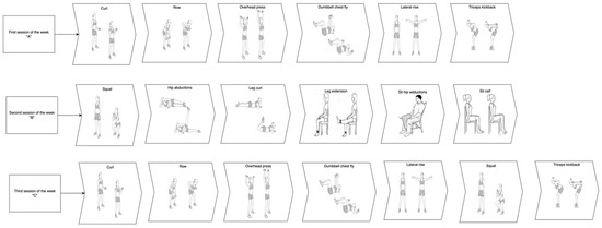 The training period ran from December 2021 to February 2022. The training protocol lasted 11 weeks tri-weekly, it was performed at the participant’s home using digital platforms with the help of two physical exercise experts. Each training session lasted 90 min and had three stages: the warm-up, the main workout, and the cool-down. The warm-up and the cool-down were the same for the entire duration of the study. The warm-up included breathing exercises and mobility exercises for the scapula-humeral, ankle, and hip joints, and the cervical spine and pelvic region. Each movement was performed for 10 repetitions or (if the movement was unilateral) five repetitions on each side with a rest period between 30″ and 40″ for each set. The difficulty of the exercises was increased with the use of different tools from one week to the next (Table 1). The cooldown included stretching exercises for the cervical spine, torso, upper limbs, and lower limbs. Each stretch position was maintained for 15 s. After the warmup, the main workout included three different weekly sessions (A, B, and C) of resistance training with intensity progressively increasing. Figure 1 is a general representation of each exercise performed by participants. The protocol, with the progression and the tools used, is detailed in Table 1.