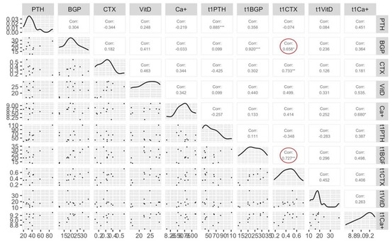 Correlation analysis between T0 and T1 for bone metabolism markers shows a strong positive correlation (red circle Figure 2) between CTX T1 with BGP T0 (r = 0.66, p < 0.05) and with BGP T1 (r = 0.73, p < 0.01). Correlations are shown in Figure 2.