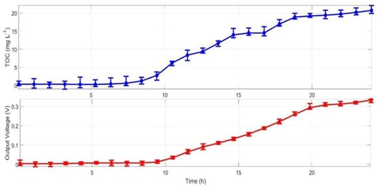 This novel bioelectrochemical technology makes it feasible to achieve improvement of wastewater treatment efficiency and recovery of energy simultaneously []. Theoretically, as substrates of electricigens, the MFC-biosensors output voltages can reflect organic matters concentration in the PSP directly based on their quantitative relation determined by linear regression; therefore, MFC-biosensors are extensively applied for open-loop prediction for water pollutants [,,]. However, open-loop predictions have two obvious disadvantages as follows: