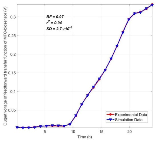 The three common indexes, best fit (BF), Spearman correlation (r) coefficient, and Nash–Sutcliffe efficiency standard deviation (SD) were applied for model validation by measurement of similarity between measured output voltage of MFC-biosensor in experiment and prediction from its transfer function (Equation (2)).