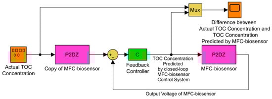 Based on the transfer function of MFC-biosensor and its feedback controller, the simulation model of the closed-loop MFC-biosensor was established on the platform of Matlab/Simulink to investigate its dynamic response characteristics to different reference voltage inputs. Based on cybernetics, if the closed-loop MFC-biosensor control system can perfectly track the reference inputs, the output of feedback controller is exactly the prediction of TOC concentration in the PSP water. In order to prove it, the simulation model of closed-loop MFC control system was changed by inserting a copy of MFC-biosensor between the signal generator block producing different reference inputs of actual TOC concentration in PSP water and the sum block (Figure 5).