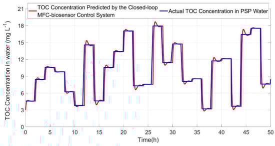 TOC prediction from the feedback controller of the closed-loop MFC-biosensor control system with different TOC concentrations in PSP water as reference inputs.