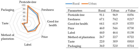 The results found that 61.6% of consumers sometimes purchased VF, 76.3% purchased VF from markets, and 40.4% purchased organic VF. When comparing the habits among rural and urban consumers, urban consumers purchased organic VF (53.6%) more frequently than rural consumers (36.8%). Rural consumers purchased VF from markets (80.2%) and planted VF themselves (6.4%) more frequently than urban consumers (61.8% and 2.1%, respectively) (Table 1).