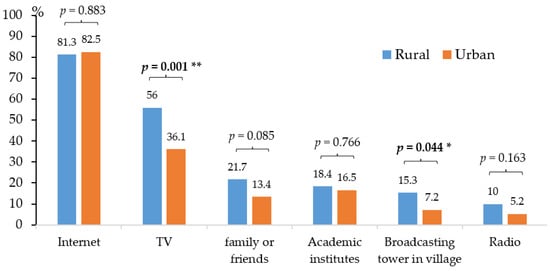 Figure 1 presents the list of considerations of consumers for VF purchasing. Most consumers chose to purchase pesticide-free VF (91.1% for rural and 96.9% for urban); the second highest consideration was freshness (67.1% for rural and 74.2% for urban), followed by health (64.1% for rural and 61.9% for urban, respectively). When asked about the source of their information about pesticides, most consumers got the information from the internet (81.3% for rural and 82.5% for urban), followed by TV (56% for rural and 36.1% for urban). Rural consumers got information from TV (56%) and from a broadcasting tower in their village (15.3%), a significantly higher level than urban consumers (36.1% and 7.2%, respectively) (Figure 2).