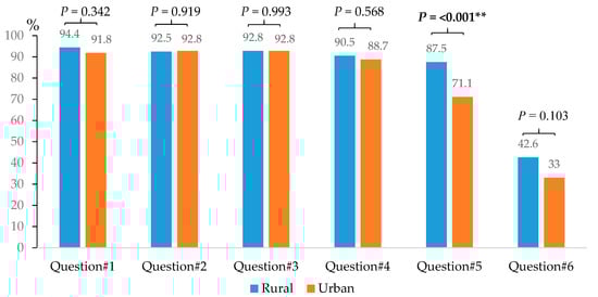 Rural consumers had significantly higher knowledge, attitude, and behavior scores than urban consumers when considering the types of VF products. Behavior scores regarding the cleaning of VF products and cooking methods in rural consumers were significantly higher than those in urban consumers (Table 2). The results also indicated that rural consumers needed to plant VF for their own eating significantly more often than urban consumers (87.5% for rural and 71.1% for urban) (Figure 3).