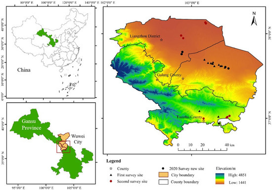 The Qilian Mountains are located at the intersection of the Loess Plateau, the Qinghai-Tibet Plateau and the Mongolian-Xinjiang Plateau. They are divided into north and south foothills according to the boundary between Gansu and Qinghai Province. The northern foothills mainly cover Wuwei, Zhangye, Jinchang, Jiuquan and Jiayuguan in the Hexi Corridor in Gansu Province. With the improvement of ecological management and construction of national parks in the Qilian Mountains, this area has become an area of national ecological sustainability and green development. As the most typical topographic transitional zone and ecologically fragile part of this area, Wuwei City (101°49′–104°16′ E, 36°29′–39°27′ N) serves two functions: protecting water from the south and preventing desertification from the north (Tengger Desert to the north and the Qilian Mountains to the south) (Figure 1). This area is dry, rainy and windy, with a total area of 3.32 × 104 km2, of which 65.5% is desert. Approximately 33.37 × 102 km2 of the city area is devoted to the Qilian Mountain National Park. As of 2020, Wuwei City had jurisdiction over one district (Liangzhou) and three counties (Tianzhu, Gulang and Minqin), with a total population of 195.23 × 104, the agricultural population accounting for 52.99%. Initially, the city formed a trend of multi-business development of “agriculture +” by developing “three characteristic industrial belts” along mountains, rivers and sand, and “eight industries” of cattle, sheep, chicken, vegetables, fruit, edible mushroom, potato and Chinese herbal medicine.