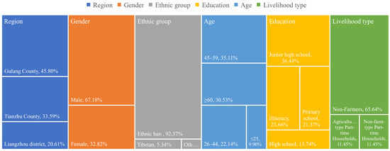 A total of 67.18% of respondents were males, 92.37% were Han nationals, 65.64% were over the age of 45, and 17.56% had a high school education or higher (Figure 2). Respondents had an average household size of five, a population burden ratio of 0.464, and a livelihood diversification index of only 1.74. Out-migration for work was the major source of income. The proportion of non-farm households accounted for 65.64% of the total sample, with an average non-farm income of CNY 29,030 per household. Liangzhou District, Gulang County and Tianzhu County allocated land according to per capita standards of 0.133 hm2, 0.117 hm2 and 0.100 hm2. As a consequence of the lack of irrigation water and the predominantly sandy soil, approximately 32.82% of immigrants transferred the newly acquired land to local planting enterprises. The average household transfer income was CNY 1881 per year. Under the influence of capital allocation, economic shock and livelihood transformation, 67.44% of the respondents were threatened by multiple risks such as economic, policy, welfare, health and security [6]. There was a risk of returning to poverty and disorder at the family and community scale due to disconnection and system mismatching. Yet 20.1% of immigrants believed that their living standards would definitely improve in the next five years with the implementation of a series of supporting policies, including poverty alleviation, targeted poverty alleviation and rural revitalization, and only 13.6% believed that they would decrease in the next five years. The future livelihood strategy of expanding breeding scale was preferred by 39.52% of the respondents.