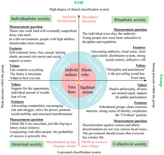 The grid−group culture theory, based on Emile Durkheim’s structuralism theory and George Boole and Garrett Birkhoff’s “grid theory”, provides a powerful explanation for complex social phenomena [13]. It is widely used to analyze cultural types and international relations, causal and structural links between social groups and risk selection, the influence of organizational culture on new product development performance, corporate cultures, policy analysis and public management research. Hood uses “grid−groups” to classify the basic organizational types of public administration models in various countries since ancient times [14]. He discusses whether a good institution is primarily governed by rules, laws, or the judgment of wise men from the perspective of the “grid”. Furthermore, he discusses how to coordinate and build a governance network among professionals, private businesses and ordinary people in a good system from the perspective of the “group”. Zhang believes that the current network class has the characteristics of a “weak grid” and “strong group” [13]. Administrative management is weakened, conflicts are focused and cyberspace governance is difficult in this scenario. These problems can be solved by changing the pattern of “group” and “grid”, using class interaction, network opinion leaders, polycentric governance and moderately strengthening management. Natural Symbols, a book by Mary Douglas published in 1970, was the first to propose the “grid−group” theory. She divided the social types into ritualistic, collectivist, individualistic and atomized society through the power direction (grid refers to the degree of consistency within the public classification system, i.e., their structural position) and status direction (group, that is, an individual’s choice of action is influenced by the pressure within their group), and corresponding sequences in turn order culture (hierarchy), alien cultural circles (egalitarianism), competitive culture (individualism), self-centralization (fatalism) and autonomy (the origin) of five cultural types [15,16,17,18,19], and the complex groups, simple groups, individualist, isolationist and reclusive groups (Figure 3).
