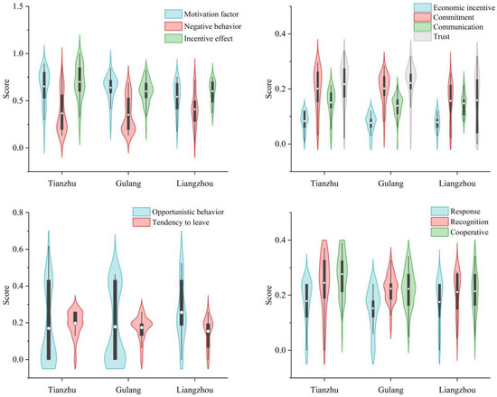 Wuwei immigrants were rated at 0.079 on the evaluation of government economic incentives (Figure 5), with Tianzhu County having the highest score (0.083), followed by Liangzhou District (0.079) and Gulang County (0.076). There was no significant difference between regions (Levene statistic was 0.286, and the variance between groups was homothetic, and p = 0.598). The overall evaluation value of immigrants for the government’s non-economic incentive factors was 0.623, of which the trust motivation dimension scored the highest (0.207), followed by commitment (0.192) and communication (0.144). Significant differences were observed between regions (Levene statistic 2.750, homogeneity of variance between groups, p = 0.013). The score of Tianzhu County (0.651) was higher than that of Gulang County (0.638) and Liangzhou District (0.541). According to the post hoc multiple test results of LSD and S-N-K, Liangzhou District government scored significantly differently from Tianzhu County and Gulang County for non-economic incentive factors (p values were 0.006 and 0.01, respectively). In terms of government commitment incentive, the immigrants from Gulang County were rated the highest (0.220), while those from Liangzhou District were rated the lowest (0.157). The difference between Liangzhou District and Tianzhu County, and Gulang County (Levene statistic was 3.240, p = 0.008) was significant. Tianzhu County ranked highest in terms of communication between the government and immigrants (0.150), while Gulang County ranked lowest (0.139). Statistically, there was no difference between regions (Levene statistic was 2.759, and variance between the groups was identical, but p = 0.381). Immigrants from Gulang County had the highest trust in the local government (0.221), whereas immigrants from Liangzhou District had the lowest (0.159). Liangzhou District and Tianzhu County, and Gulang County had significant differences (Levene statistic 3.432, p = 0.002). In conclusion, there were significant regional differences in the evaluation of non-economic incentive factors of immigrants to the government, among which there were significant differences between groups in commitment and trust. Liangzhou District had the lowest score among the three places, which was significantly different to that of Tianzhu County and Gulang County.
