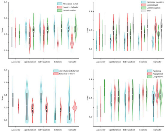 Yin et al. [20] and Zhong et al. [21] used Dake’s questionnaire design idea of cultural bias and risk structure to design 28 corresponding measurement questions regarding opinion preferences across various cultures. The cultural type of the respondents can be determined by their level of agreement with each view (score 1 to 5 on the degree of agreement). The determination methods are as follows: first, select the measurement questions (Figure 3) and calculate the average recognition of each sample for each cultural type and the average value of the total sample. Second, if one type of index is higher than the overall average, and the other types are lower than the overall average, the higher is judged as the cultural type. Third, if multiple indicators are greater than the average value, the indicator type with the largest difference will be used as the judgment type. Fourth, a type is autonomous if the values of each type are lower than the average value. In summary, the grid−group culture theory provides a new perspective on government motivation, which can be used to study differences among groups, clarify problems and their crux and aid in developing targeted adjustment strategies.