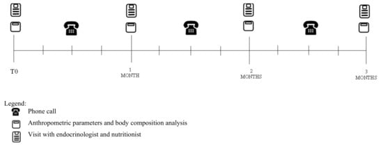 At T0, body weight (BW) and height were recorded using a Seca 200 scale with a stadiometer. Measurements were taken in the morning after an overnight fast of at least 12 h. Subjects wore underwear and were without shoes. Height was measured only at T0, while body weight was recorded every month until participants lost at least 5% of their initial body weight for a maximum of three months for both diets.