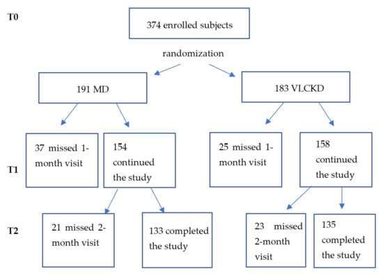 At baseline (T0), the subjects underwent an endocrinological visit to evaluate if they could be included in the study according to the exclusion and inclusion criteria. When enrolled, they were consecutively allocated to either the MD or VLCKD. Participants received nutritional counseling and were given the dietetic protocol to be followed for three months. Follow-up visits were set up once monthly until 5% body weight loss was achieved.