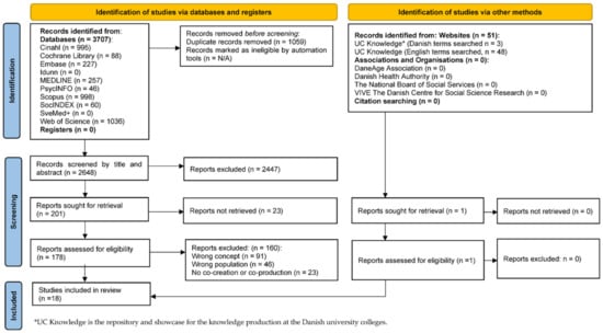 The search for relevant literature returned a total of 3707 peer-reviewed studies and 51 records from websites: Cinahl (n = 995), Cochrane Library (n = 88), Embase (n = 227), MEDLINE (n = 257), PsycINFO (n = 46), Scopus (n = 998), SocINDEX (n = 60), the Web of Science (n = 1036), and UC Knowledge (n = 51). A total of 1059 duplicates were removed which left 2648 articles to be screened by title and abstract. Out of these, 200 articles were found eligible for full-text screening; of which, 23 papers could not be retrieved. Among the remaining articles, 160 did not deal with topics concerning the co-creation or co-production of activities with older people aged 60+ and were excluded. Thus, 18 full-text articles were included [32,33,34,35,36,37,38,39,40,41,42,43,44,45,46,47,48,49]; a flow chart illustrating the study selection process can be seen in Figure 1.