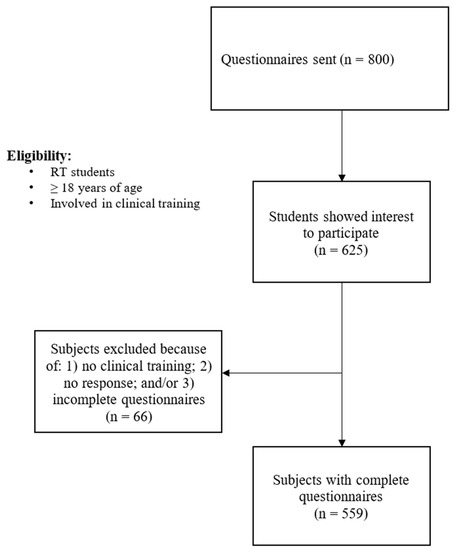 Of the 800 questionnaires sent to potential participants, 625 (78%) students agreed to participate in the study. After initial screening and accounting for non-response and incomplete questionnaires, 559 (70%) completed questionnaires were identified; and, thus, were included in the analysis, as shown in Figure 1. Male and female students were equally proportional, and more students were attending governmental/public (78%) universities than private (22%) universities. Interns and fourth-year RT students made up more than two-thirds of the total sample. The majority of students lived with their families (82%) and were single (95%). The demographic data are presented in Table 1.