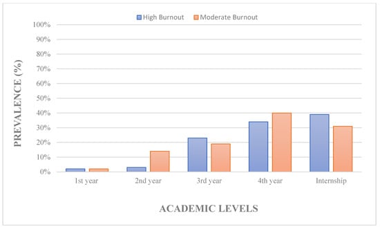 In this study, we found that the prevalence of burnout increased as students advanced in their studies. This is concordant with previous studies conducted among medical students [21,22]. It seems logical that this effect may be due to the significant impact of clinical exposures encountered by the students, especially when they proceed to senior years [23]. Indeed, RT students have to attend several hours of classes per week in addition to their clinical training hours, which happens to be mentally and physically exhausting. During the internship period, moreover, students are expected to have clinical duties similar to a full-time employee, such as having a heavy clinical load, managing 12-h shifts (day and night), and rotating across clinical areas. This transition (from working under supervision to working with less or even no supervision) is likely to put students under significant stress and contribute to increased levels of burnout.