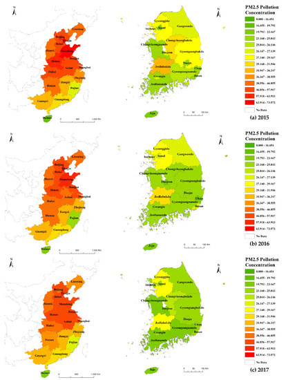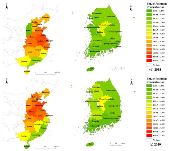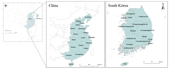 The study area included the Chinese eastern coastal region, where industrial complexes and large cities are concentrated, and entire regions of South Korea. China has three large cities (Beijing, Shanghai, and Tianjin), nine coastal regions (Liaoning, Hebei, Shandong, Jiangsu, Zhejiang, Fujian, Guangdong, Guangxi, and Hainan), and six central economic zones (Shaanxi, Henan, Anhui, Hubei, Hunan, and Jiangxi). South Korea has 34 regions, including seven large cities (Seoul, Busan, Incheon, Daegu, Daejeon, Gwangju, and Ulsan) and nine regions (Gyeonggi-do, Chungbuk, Chungnam, Jeonbuk, Jeonnam, Gangwon-do, Gyeongbuk, Gyeongnam, and Jeju-do). All these regions formed the study area (Figure 2). Annual data from 2015 to 2019 were used to analyze changes over time. For South Korea, data was available from 2015. To control for the impact of Covid-19, only data from 2015 to 2019 were used. For concentration data, IDW (Inverse Distance Weighted) spatial interpolation method was used to derive annual average values for each administrative district. The reason for using the IDW method among spatial interpolation methods was that the visualization and precision of the spatial distribution of PM2.5 concentration were superior to other interpolation methods [26] As shown in Table 1, data on variables that can be obtained from both South Korea and China were collected. For South Korea, annual data by province were collected from the national statistics portal (https://kosis.kr/index/index.do, accessed on 15 March 2022), and for China, data were collected from the national statistical yearbook [27], urban statistical yearbook [27], and environmental statistics yearbook [28].