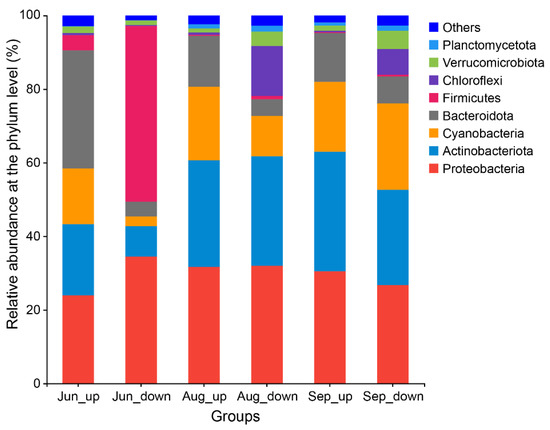Microbial community composition at the phylum level. Jun, Aug, and Sep represent the sample collection months June, August, and September, respectively. Up and down indicate the sampling sites in the upstream and downstream subsections, respectively.