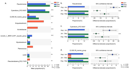 The difference in microbial community composition in different months at the genus level. Bar plots showing differences in (a) genera with high relative abundance, (b) Pseudomonas, (c) Cyanobium_PCC-6307, and (d) CL500-29 marine group. Jun, Aug, and Sep represent the sample collection months June, August, and September, respectively.