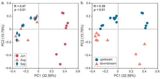 Principal coordinate analysis (PCoA) based on Bray–Curtis distances showing the distinct distribution patterns of samples in (a) June, August, and September, and (b) upstream and downstream sections. Analysis of similarities (ANOSIM) was used to test the significance of variations in community composition.