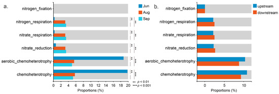 Functional annotation of prokaryotic taxa (FAPROTAX) analysis revealing the different functions in (a) June, August, and September, and (b) upstream and downstream sections.