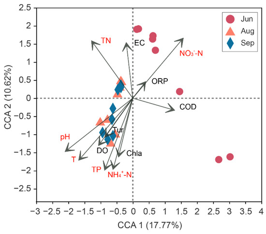 Canonical correspondence analysis (CCA) plots showing the relationship between environmental factors and microbial communities. Factors identified as significantly influencing bacterial communities are highlighted in red. Each point represents a single sample (n = 24). Jun, Aug, and Sep represent the sample collection months June, August, and September, respectively. T, water temperature; ORP, oxidation–reduction potential; EC, electrical conductivity; DO, dissolved oxygen; Tur, turbidity; COD, chemical oxygen demand; TN, total nitrogen; TP, total phosphorus; NH4+-N, ammonia nitrogen; NO3−-N, nitrate nitrogen; Chl-a, chlorophyll-a.