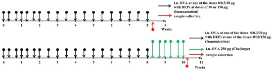 Study design. Black arrows indicate i.n. immunization of mice with OVA alone at a 0.3 µg or 30 µg dose or in combination with DEPs at a low (30 µg) or high (150 µg) dose. Animals immunized with saline alone without OVA were used as a control group. Green arrows indicate a high-dose (250 µg) OVA i.n. challenge. The time points when the mice were killed and when the samples were collected are indicated by red arrows.