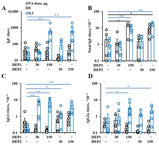 Antibody production in response to low OVA doses, DEPs, or their combination. BALB/c mice were immunized 2–3 times a week for 8 weeks (a total of 18 immunizations) via the i.n. route with 0.3 µg of OVA alone or with different types of DEP at 30 or 150 µg. The titers of OVA-specific IgE (A), IgG1 (C), IgG2a (D), and total IgE (B) were measured. The statistically significant differences of the groups immunized with OVA with particles vs. the OVA control are shown with blue bars, and the statistically significant differences of the groups immunized with particles alone vs. the saline control are shown by black bars. (*—p < 0.05; **—p < 0.01). The experiment was performed three times. The graphs show the data from three representative experiments (total number of mice included in analysis from all experiments n = 6–7 per group). The data indicate biological replicates obtained from individual mice.