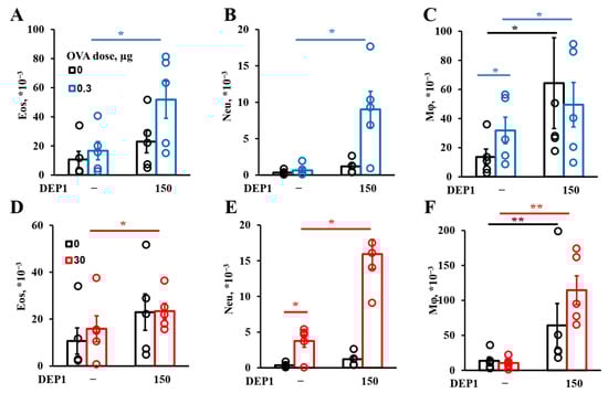 Cell response to DEPs. BALB/c mice were immunized with a low dose of OVA, 0.3 µg (A–C), or high dose, 30 µg (D–F), alone or with 150 µg of DEP1. After this, the mice were challenged three times a week for two weeks with 250 µg of OVA and sacrificed. BALs were taken, and the eosinophils (Eo), neutrophils (Neu), and alveolar macrophages (Mϕ) were quantified with flow cytometry. The experiment was performed three times. Representative data are from one out of three independent experiments. Significant differences vs. PBS are shown with black bars; those vs. 0.3 µg of OVA with blue ones; and those vs. 30 µg of OVA with red bars (*—p < 0.05; **—p < 0.01). The graphs show the data from three representative experiments (total number of mice included in analysis from all experiments n = 5 per group). The data indicate biological replicates obtained from individual mice.