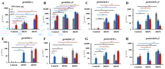 DEP1 administered with high OVA doses stimulated only local IgE class switching (Figure 4A). Only local IgE class switching was induced by DEPs, independent of their type, with both low and high OVA doses (Figure 4A). DEP1 administered in the absence of OVA induced only local IgE class switching, and DEP2 in the absence of OVA induced only systemic IgE class switching (Figure 4A,E). DEP2 induced both local and systemic IgE class switching in combination with both OVA doses in comparison with mice immunized with OVA alone (Figure 4A,E). In combination with low OVA doses, DEPs induced local but not systemic IgG1 class switching (Figure 4B,F). In combination with high OVA doses, DEP2 induced IgG1 class switching at both sites, while DEP1 induced only local IgG1 class switching in the lungs. Therefore, both types of particles accelerated the IgG1 class switching (germline γ1 expression) in lung tissue after the administration of low OVA doses (Figure 4B). However, in the absence of OVA, both types of particles were capable of inducing germline γ1 expression at both sites. Both types of particles induced the accumulation of postswitch ε transcripts in the lungs and regional lymph nodes, as well as DEP2 in combination with low OVA doses in the case of the lymph nodes (Figure 4C,G).