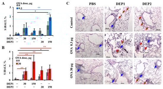 Histological analysis of lung tissue after prolonged OVA and DEP administration. BALB/c mice were immunized 2–3 times a week for eight weeks (a total of 18 immunizations) via the i.n. route with the indicated doses of OVA and different doses of DEP1 or DEP2. Following immunization, the mice were sacrificed and the lungs were isolated and stained for histological analysis (H&E). Relative areas of iBALT on histological sections of mice immunized with PBS and low OVA doses with or without DEPs in either 30 or 150 µg dose (A) or with high OVA doses with or without the same doses of DEPs (B), and representative histological images (100×) (samples from mice immunized with or without DEPs in 150 µg dose) (C) are shown. Red arrows correspond to DEPs; blue arrows show iBALTs. Black bars show significant differences between the groups immunized with particles alone and PBS control (*—p < 0.05; **—p < 0.01). Blue and red bars show differences between the mice immunized with low (blue) or high (red) OVA doses together with DEPs and mice immunized with OVA alone. The experiment was performed twice. The graphs show the data from three representative experiments (total number of mice included in analysis from all experiments n = 6–7 per group). The data indicate biological replicates obtained from individual mice.