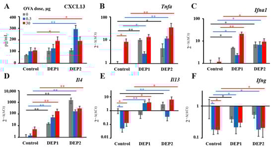 Both types of particles triggered the expression of Ebi2, a marker of extrafollicular focus formation [46], and this effect was independent of the co-administered OVA dose (Figure 7C). The effects of high DEP1 and DEP2 doses on CXCL13 production and proinflammatory cytokine genes’ expression in the lungs are shown in Table 3.
