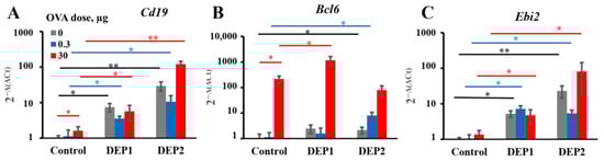 Expression of B-cell-related genes in lung tissue. BALB/c mice were immunized as described in Figure 4 with or without high (150 µg) DEPs doses. Control mice were immunized in the absence of DEPs. Expression of markers for relative B-cell numbers (Cd19; (A)), germinal center formation (Bcl6; (B)), and B-cell extrafollicular activation (Ebi2; (C)) is shown. Black bars indicate significant (*—p < 0.05; **—p < 0.01) differences between the mice immunized without OVA with different DEPs and the respective control without DEPs; green bars indicate significant differences between the mice immunized with low OVA doses with or without DEPs and the respective control groups; red bars indicate significant differences between the mice immunized with high OVA doses with or without DEPs and the respective control groups. The experiment was performed three times. The graphs show the data from three representative experiments (total number of mice included in analysis from all experiments n = 6 per group). The data indicate biological replicates obtained from individual mice.