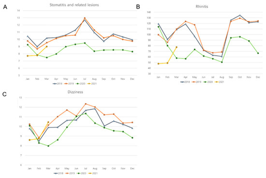 Monthly incidences of (A) stomatitis and related lesions, (B) rhinitis, and (C) dizziness. (y-axis: ×10,000 person).